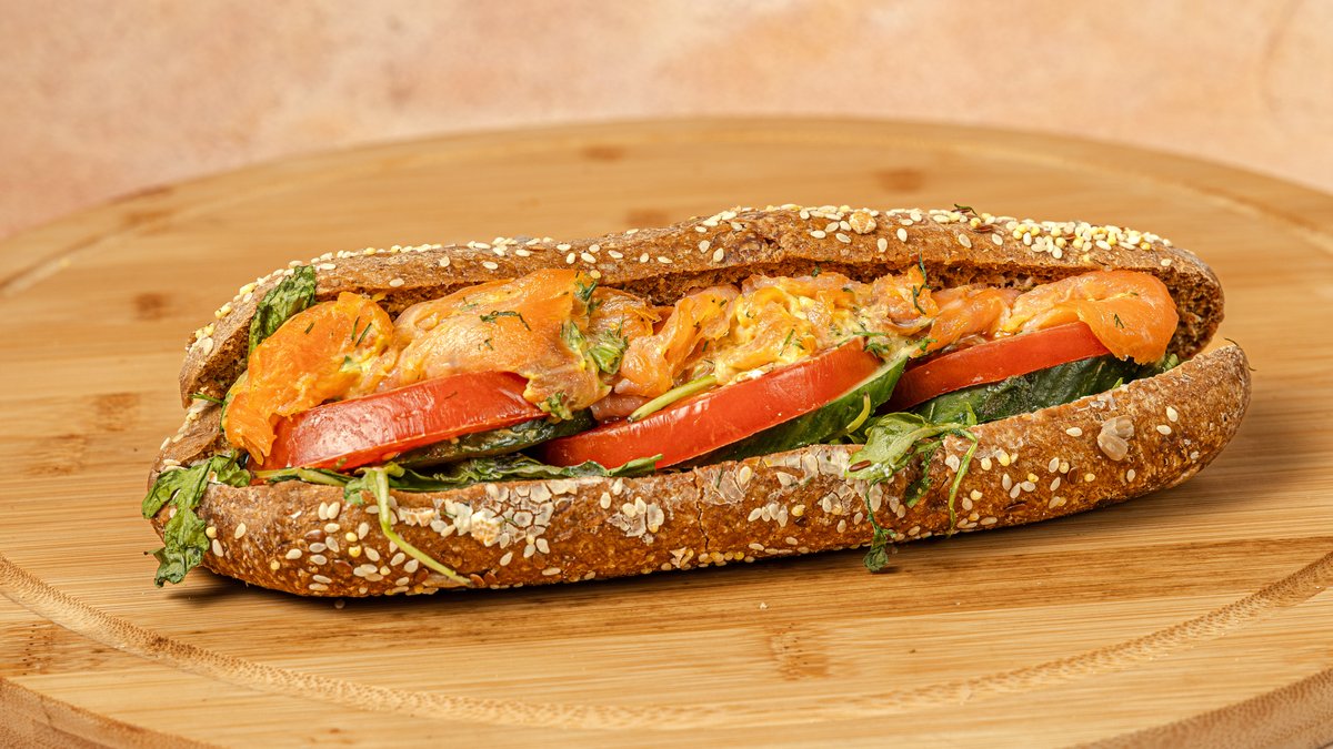 Σάντουιτς με σολομό, τυρί κρέμα αρωματισμένο, ρόκα, μαρούλι, ντομάτα και αγγούρι
