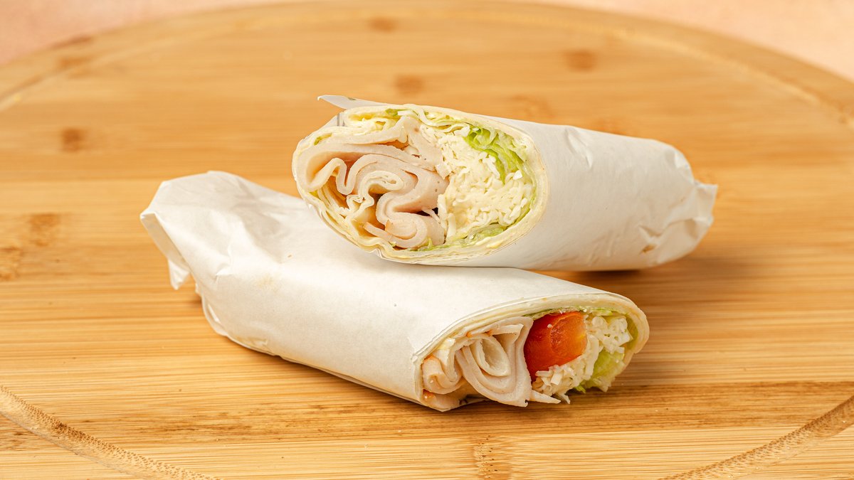 Τορτίγια με γαλοπούλα, τυρί γκούντα, ντομάτα, μαρούλι και μουσταρδομαγιονέζα