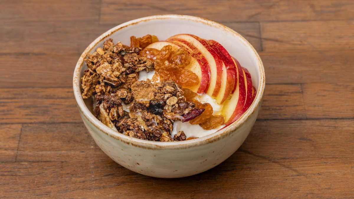 Γιαούρτι, μήλο, σταφίδες, καρύδια, γκρανόλα, μέλι και κανέλα
