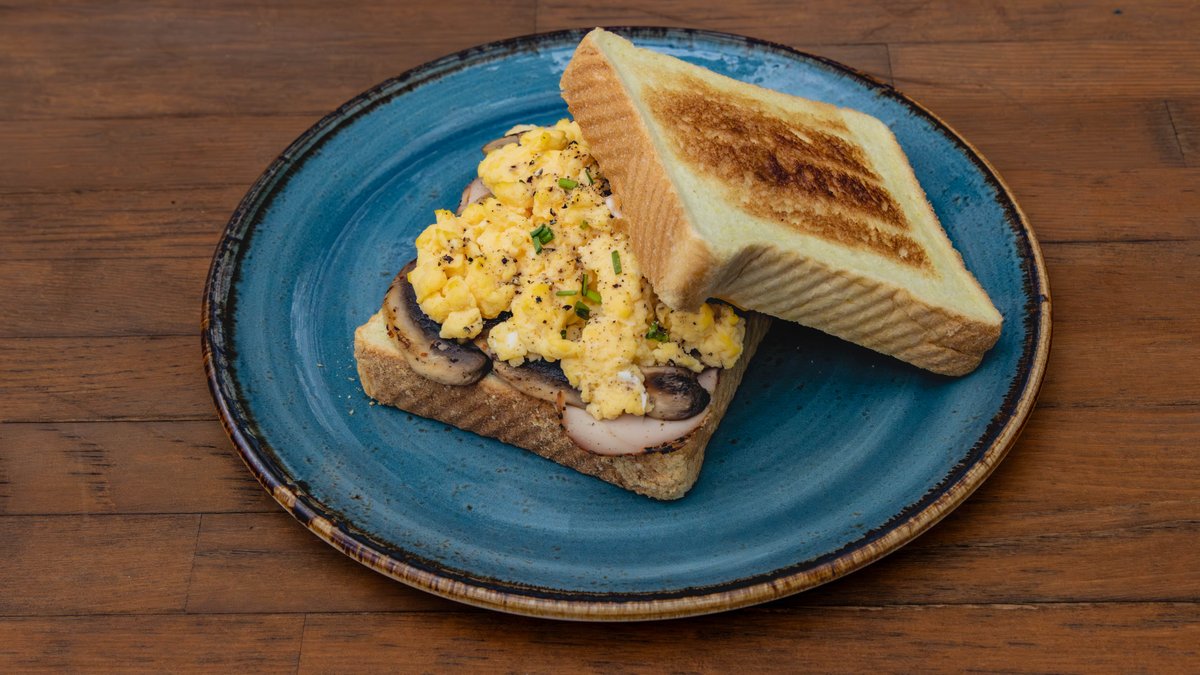 Scrambled eggs, μανιτάρια σοτέ, γλυκόξινη μαγιονέζα και παστράμι