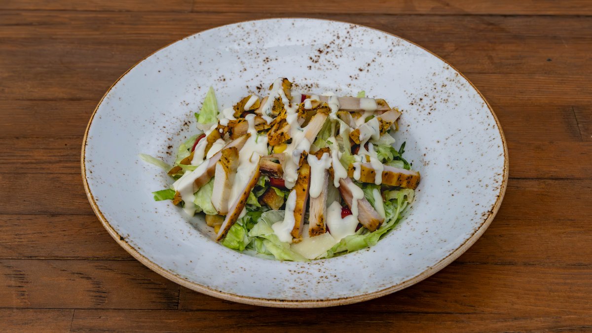 Κοτόπουλο, μείγμα τυριών, τοματίνια και ρόκα συνοδεύεται με σαλάτα