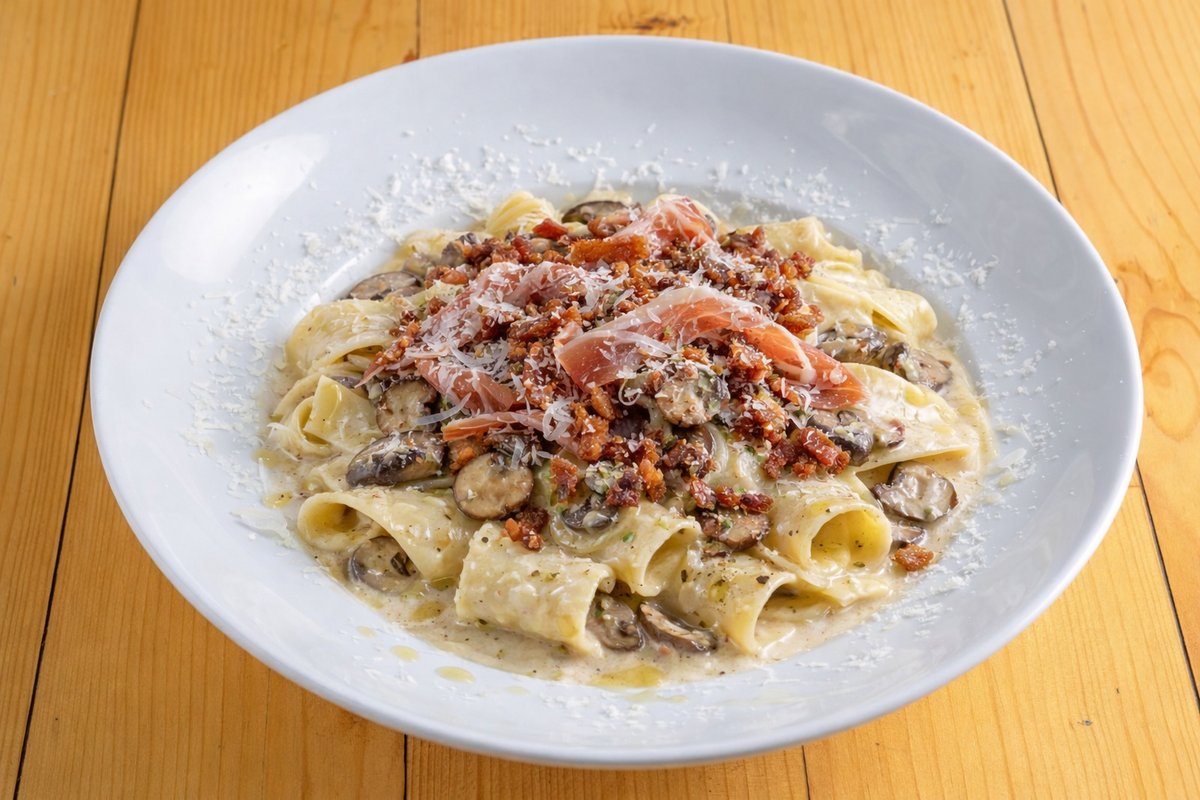 Με κρέμα τυριού, ποικιλία μανιταριών, προσούτο crudo, μπέικον, κρέμα παρμεζάνας και λάδι άσπρης τρούφας