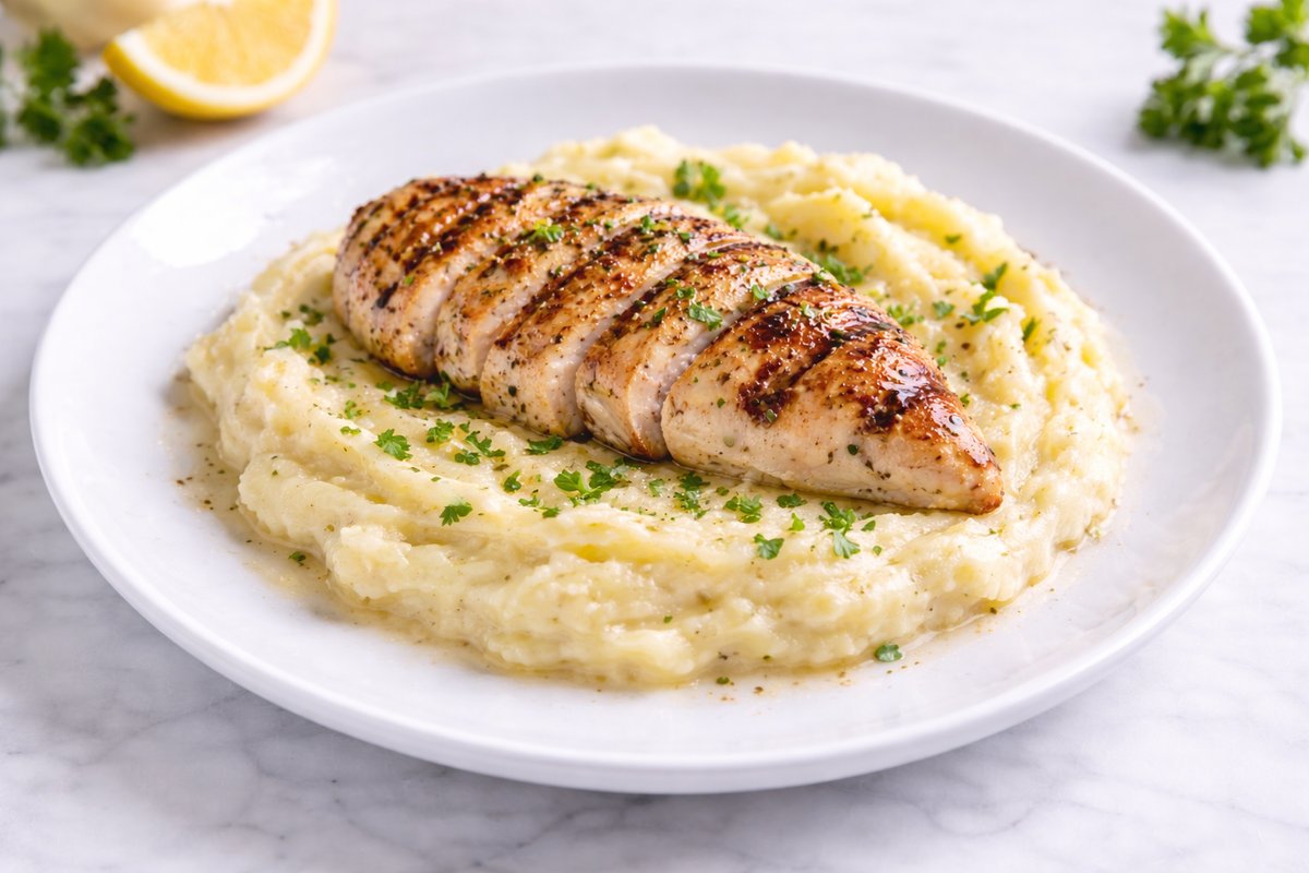 Στήθος κοτόπουλο ψημένο σε χαμηλή θερμοκρασία στη σχάρα, με πουρέ πατάτας και χυμό λεμονιού