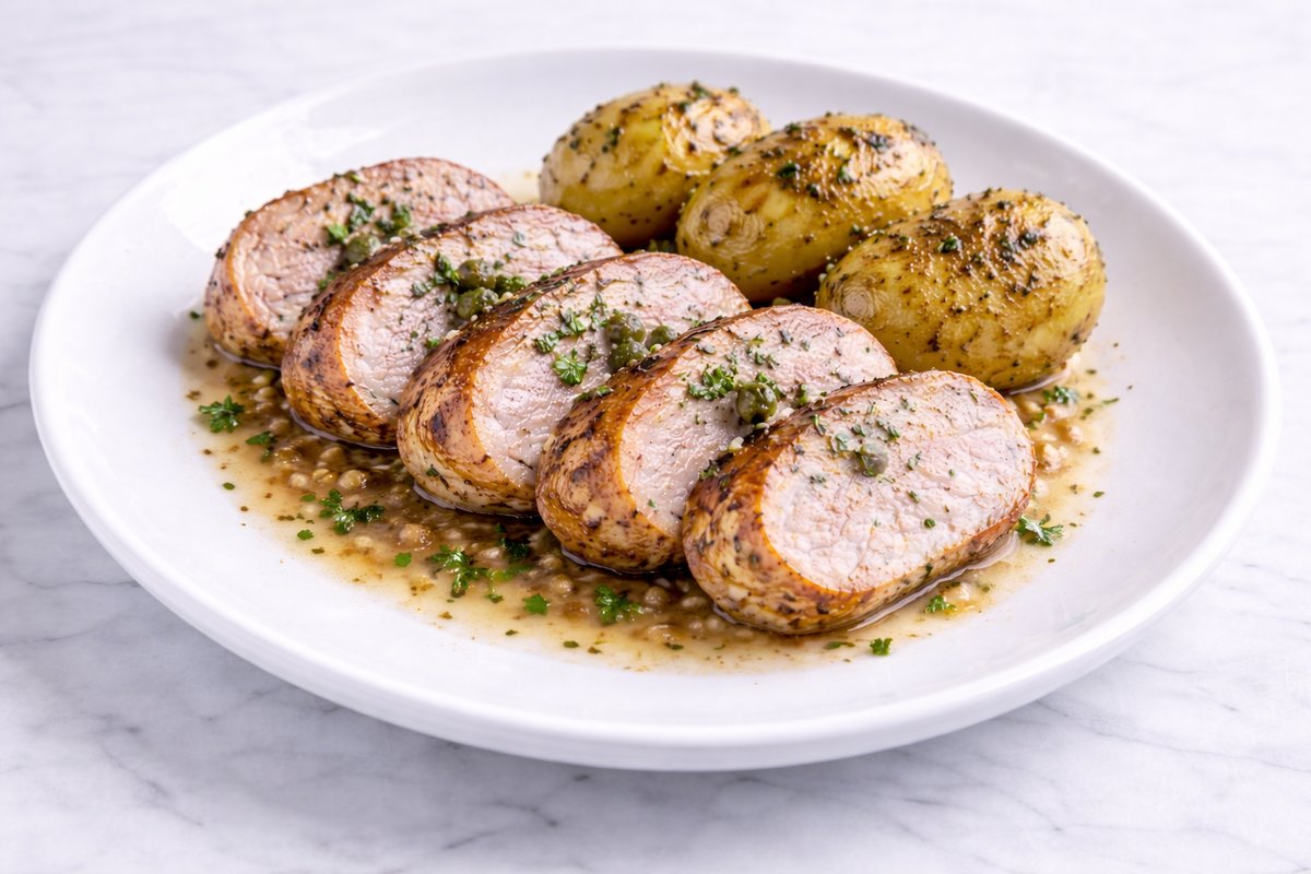 Λεπτές φέτες ψαρονέφρι μενταγιόν με σάλτσα λεμονιού με κάπαρη, φρέσκο θυμάρι και πατάτες βουτυράτες στον φούρνο