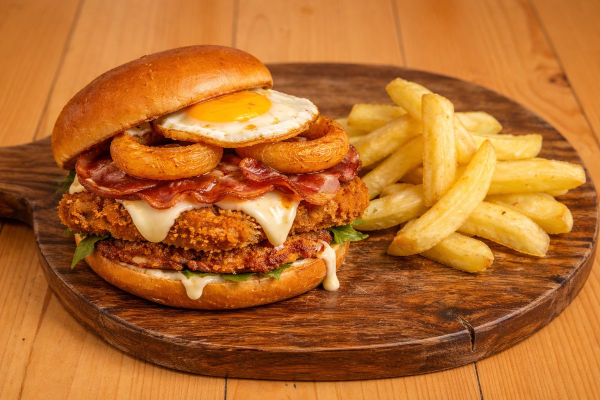Με κομμάτια παναρισμένο κοτόπουλο 180g, καπνιστή μοτσαρέλλα, τραγανό μπέικον, onion rings, αυγό, sweet - sauce. Συνοδεύεται με πατάτες τηγανιτές.