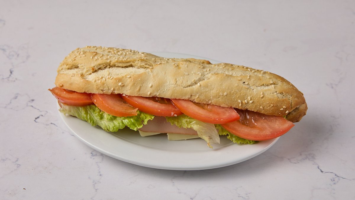 Μπαγκέτα με γαλοπούλα, τυρί, ντομάτα, μαρούλι, μαγιονέζα