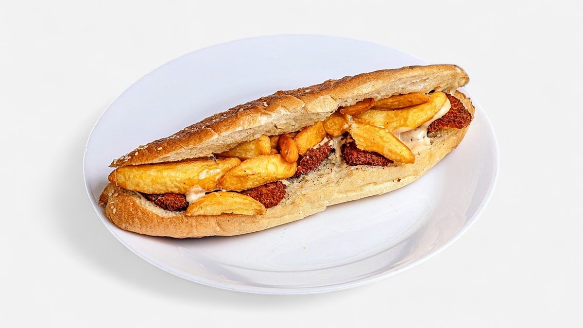 Με ζαμπόν, gouda, ντομάτα, μαρούλι και μαγιονέζα. Συνοδεύεται από πατάτες τηγανητές