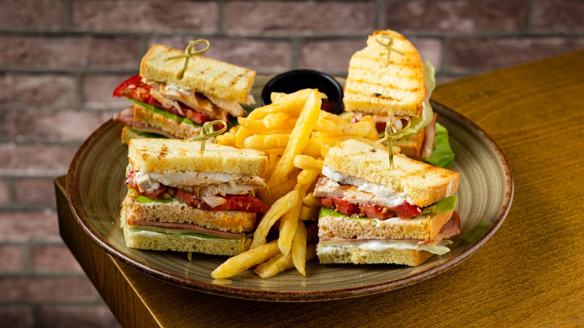 Σε χωριάτικο ψωμί με edam, φιλέτο κοτόπουλο, μπέικον, ντομάτα, μαρούλι, μαγιονεζα και πατάτες rustic