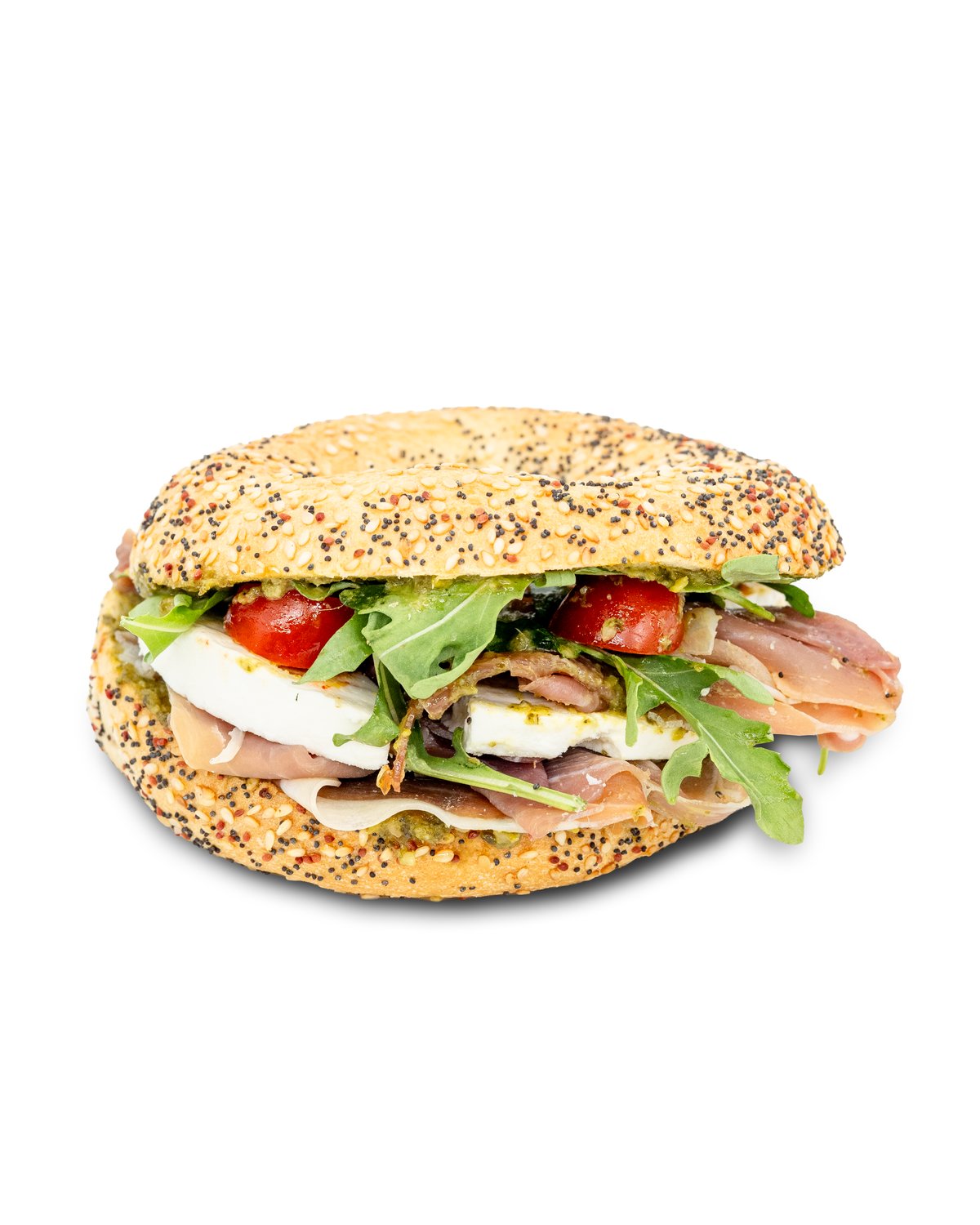 Με προσούτο, μοτσαρέλα, ντοματίνια, ρόκα και πέστο βασιλικού