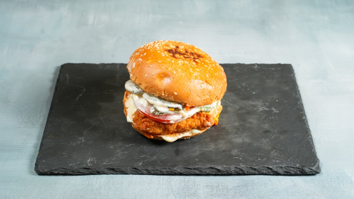 Με ψωμάκι brioche, κοτόπουλο, cheddar, iceberg, πίκλες και aioli sauce
