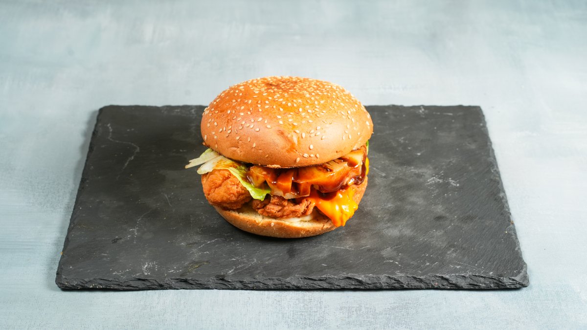 Με ψωμάκι brioche, κοτόπουλο, cheddar, iceberg, ανανά, μαγιονέζα και BBQ sauce