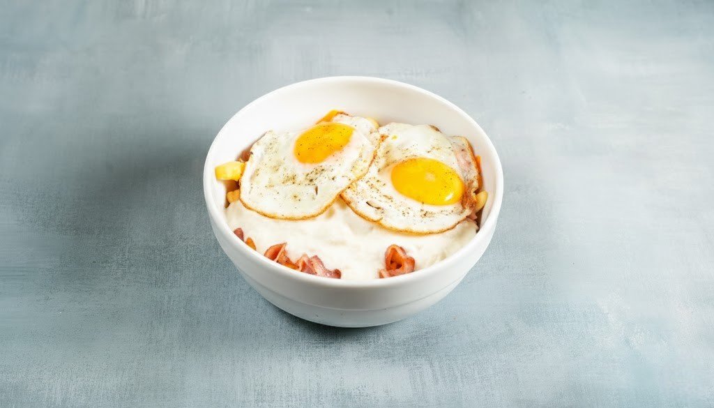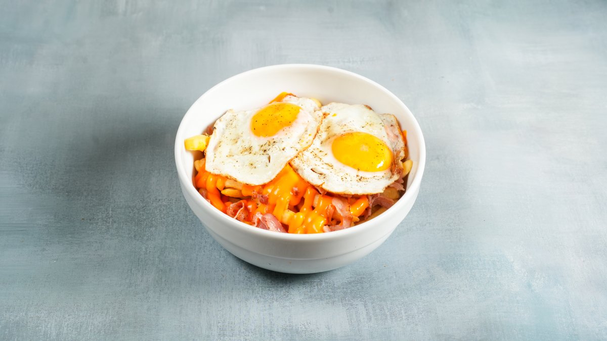 Με ψωμάκι brioche, διπλό μπιφτέκι μοσχαρίσιο 150g, διπλό καπνιστό τυρί, διπλό μπέικον, αυγό τηγανητό, ντομάτα, μαρούλι και μαγιονέζα