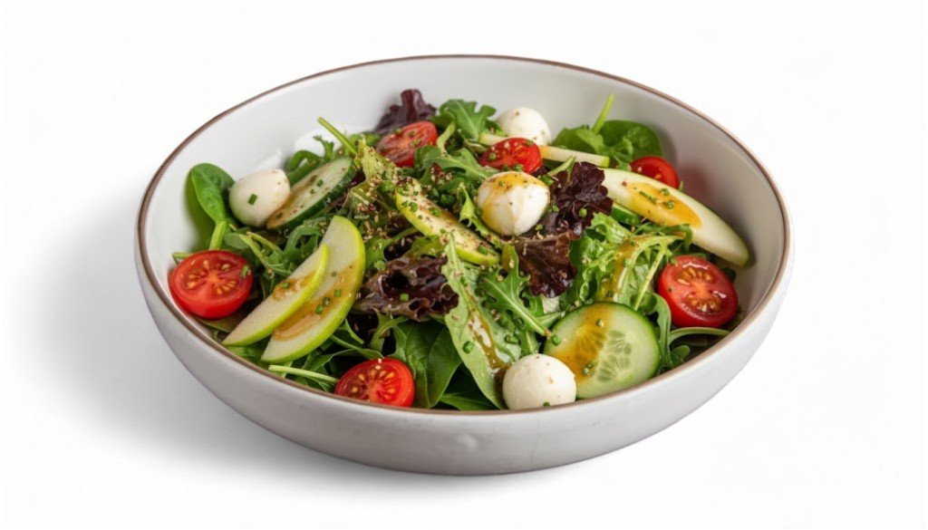 Ανάμεικτη πράσινη σαλάτα με ντοματίνια, αγγούρι, μοτσαρελάκια, πράσινο μήλο και dressing βαλσάμικο με πορτοκάλι
