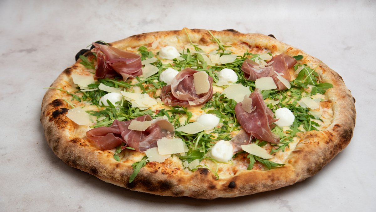 Σάλτσα πίτσας, mozzarella, προσούτο, ρόκα, λάδι τρούφας, φρεσκοτριμμένο πιπέρι, παρμεζάνα flakes