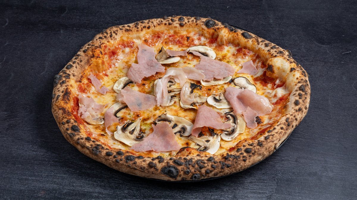 33cm. Με ιταλική σάλτσα ντομάτας, mozzarella, παρμεζάνα, προσούτο βραστό και μανιτάρια λευκά φρέσκα