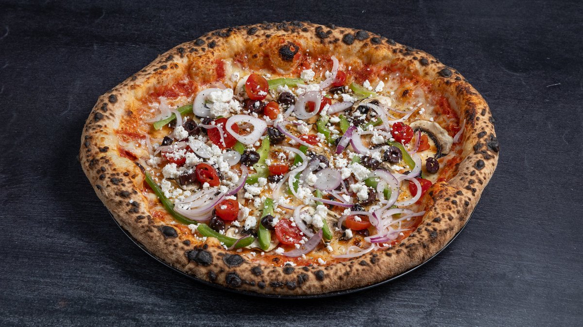 Με ιταλική σάλτσα ντομάτας, mix τυριών (gouda και mozzarella), ντοματίνια, μανιτάρια λευκά φρέσκα, πιπεριά πράσινη, κρεμμύδι, ελιές, φέτα και ρίγανη
