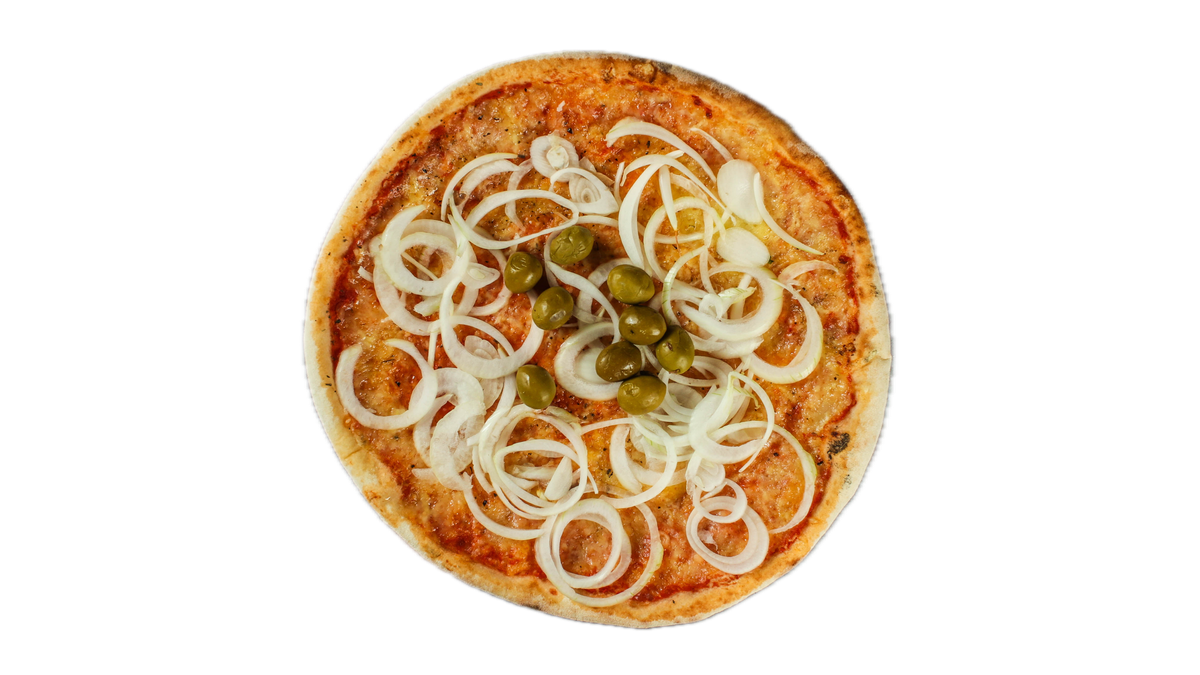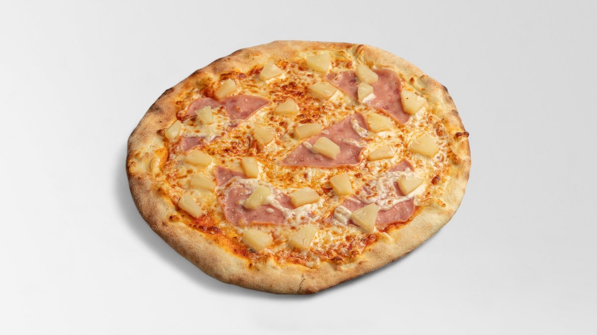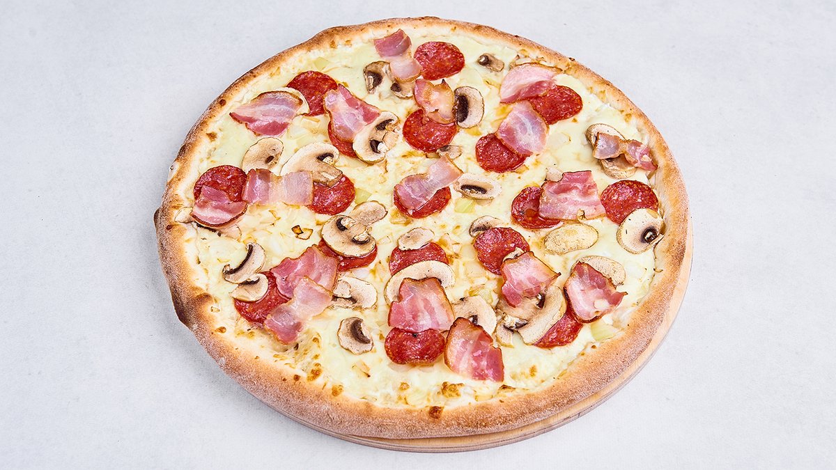 Με σάλτσα ντομάτας, gouda, mozzarella, μπέικον, ζαμπόν, μανιτάρια και πιπεριές