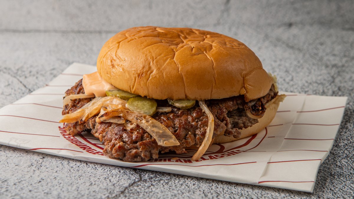 Με διπλό μοσχαρίσιο μπιφτέκι, αμερικάνικο τυρί, secret sauce, πίκλες, ψητά κρεμμύδια
