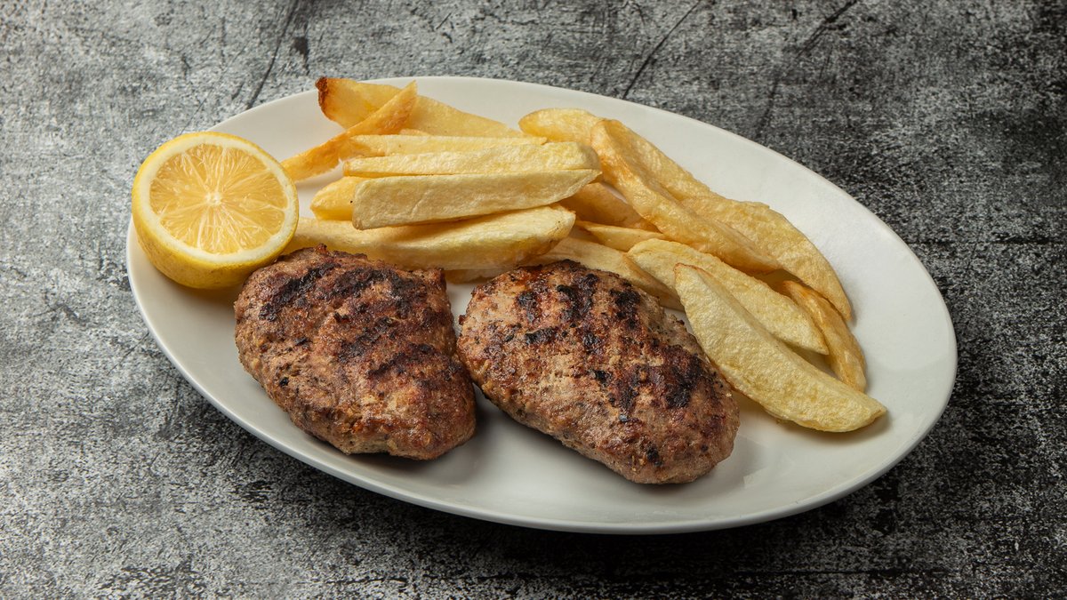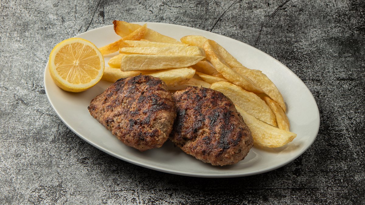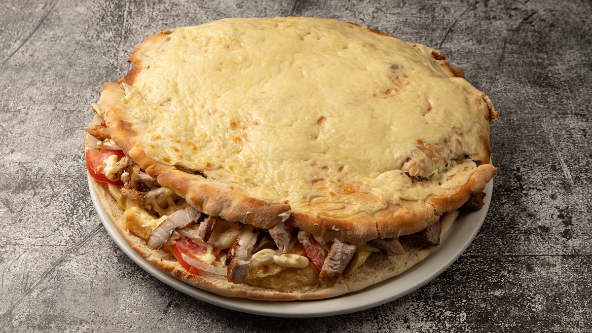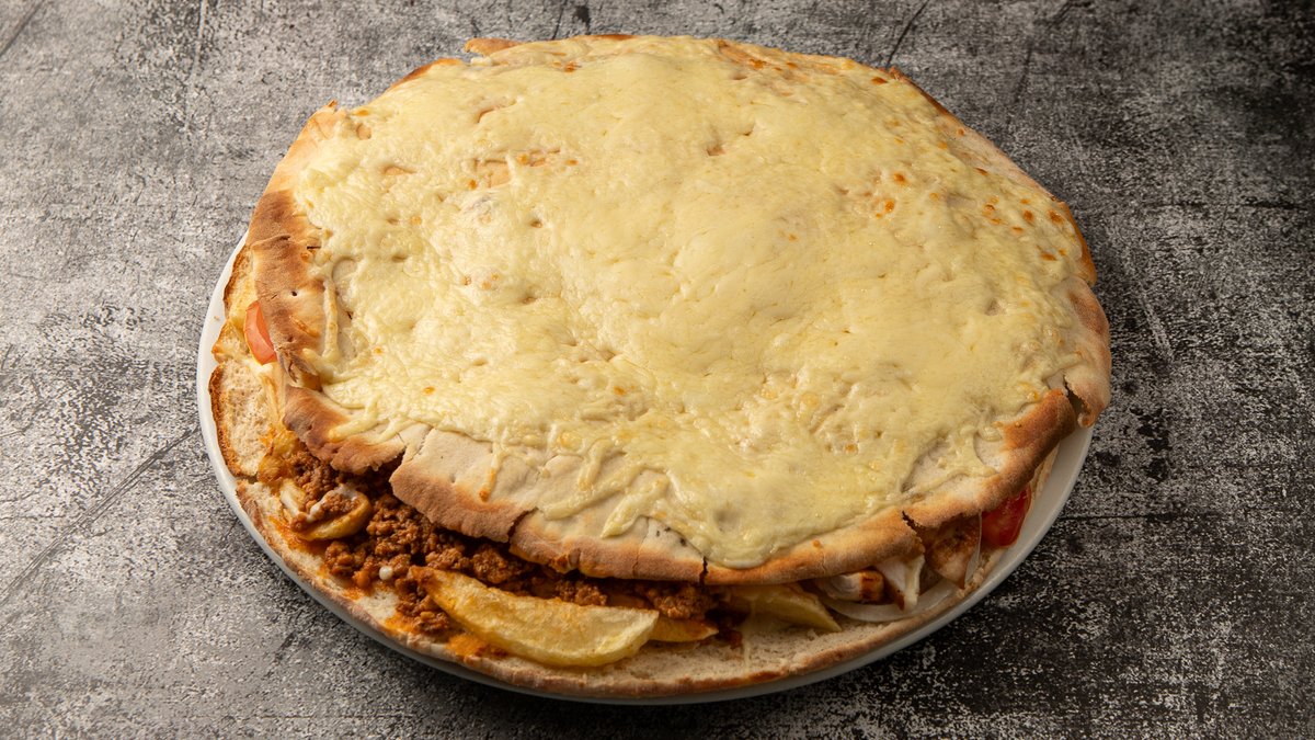 Σκεπαστή με μπιφτέκι, πατάτες τηγανητές, κρεμμύδι, ντομάτα φρέσκια, τυρί, μαγιονέζα.