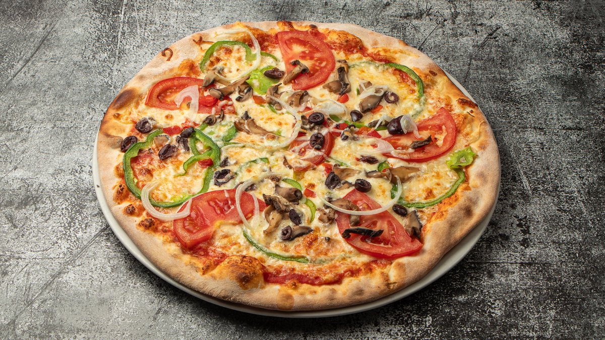 Ντομάτα φρέσκια, πιπεριά πράσινη & κόκκινη, μανιτάρι, κρεμμύδι, ελιές, σάλτσα ντομάτας & τυρί