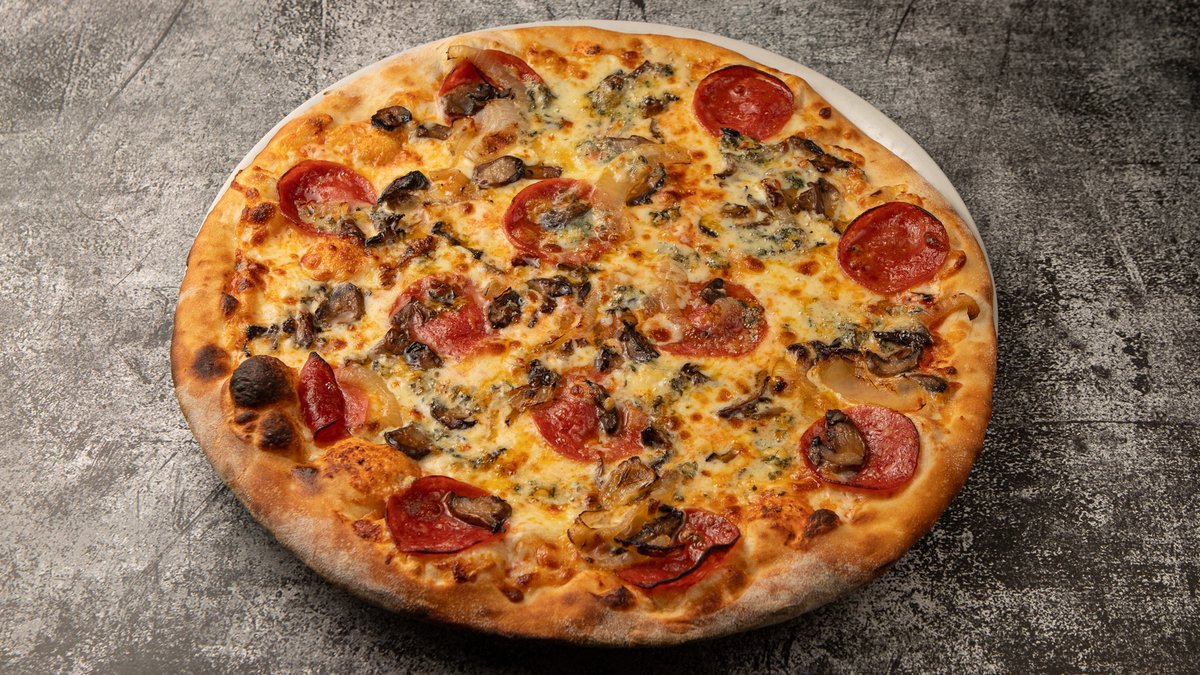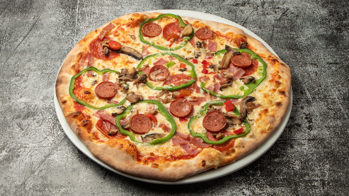 Σάλτσα ντομάτας, τυρί, ζαμπόν, μπέικον, λουκάνικο, πεπερόνε, μανιτάρια, πιπεριά πράσινη & κόκκινη
