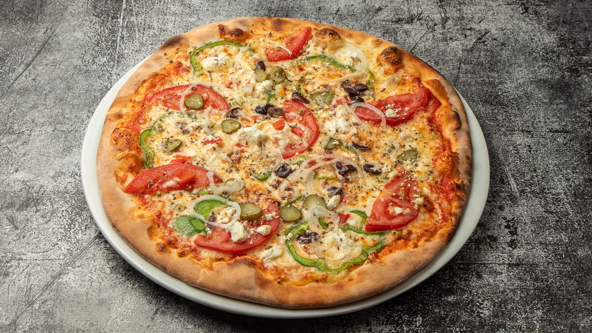 Σάλτσα ντομάτας, τυρί, ντομάτα φρέσκια, πιπεριά πράσινη & κόκκινη, αγγούρι πίκλα, ελιές, κρεμμύδι και αρωματισμένο ελαιόλαδο