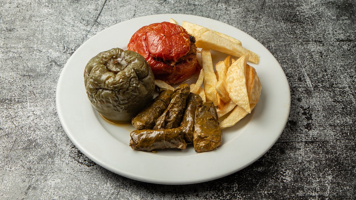 Πιπεριά πράσινη και ντομάτα γεμιστές με λαχανικά, ρύζι και μυρωδικά. Συνοδεύεται με πατάτες τηγανιτές και ντολμαδάκια.
