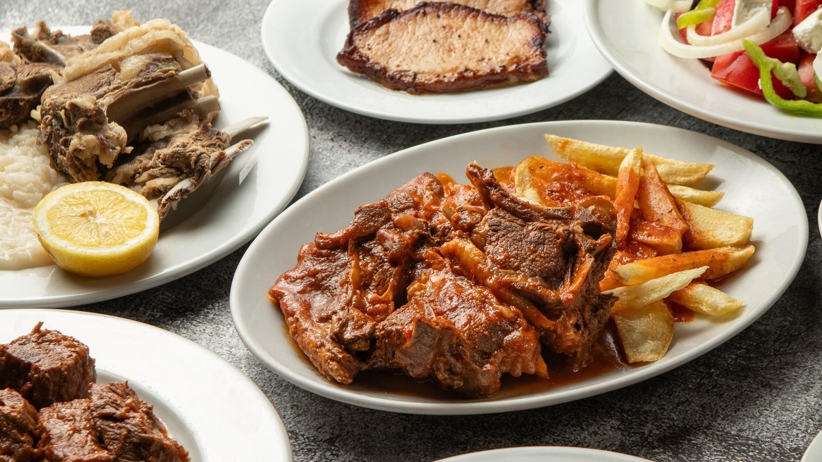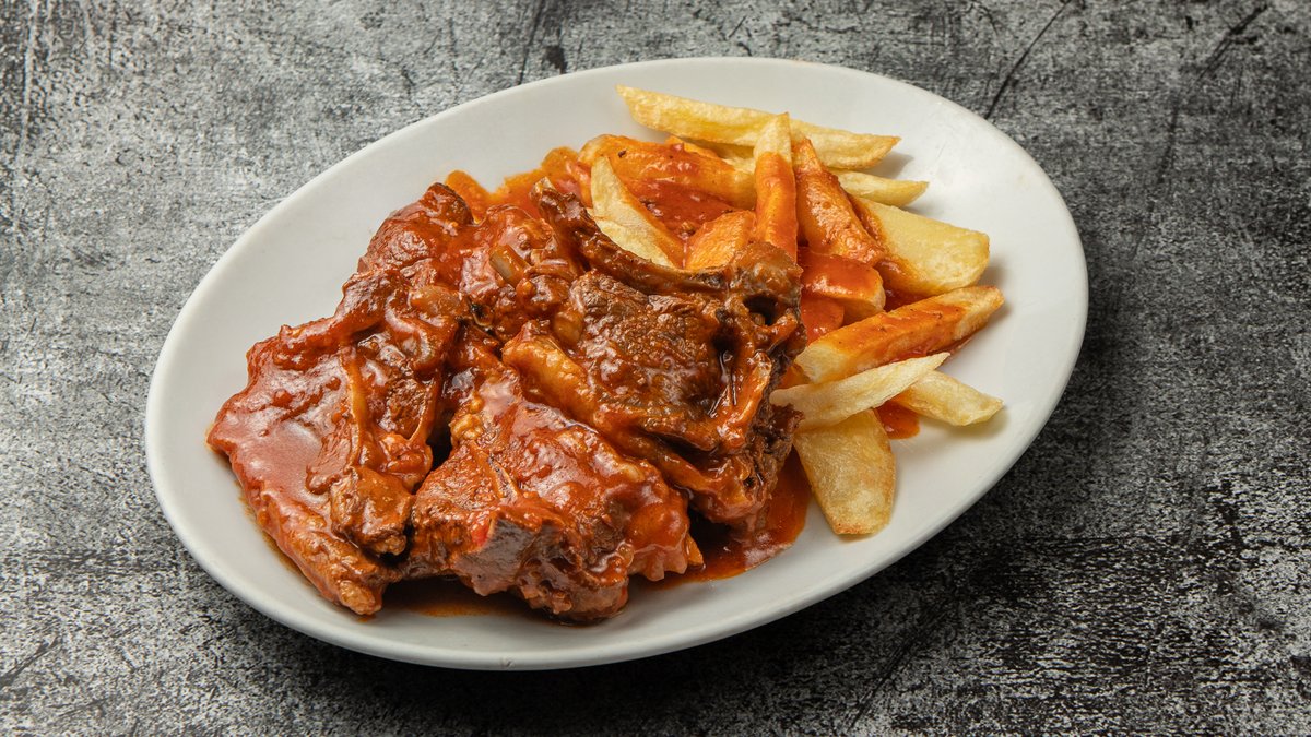 Κατσίκι Κοκκινιστό με Πατάτες Τηγανητές