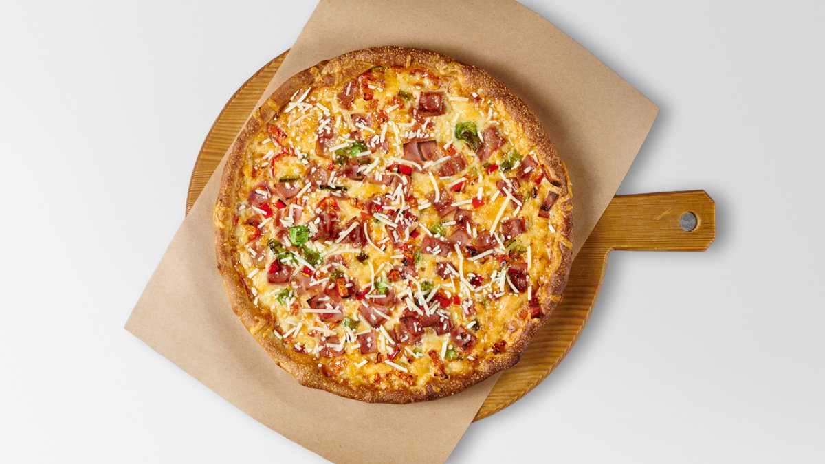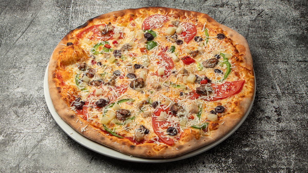 Σάλτσα ντομάτας, τυρί, ζαμπόν, μπέικον, λουκάνικο, ντομάτα φρέσκια, ρίγανη, κεφαλοτύρι, καραμελωμένα κρεμμύδια, πιπεριά πράσινη & κόκκινη
