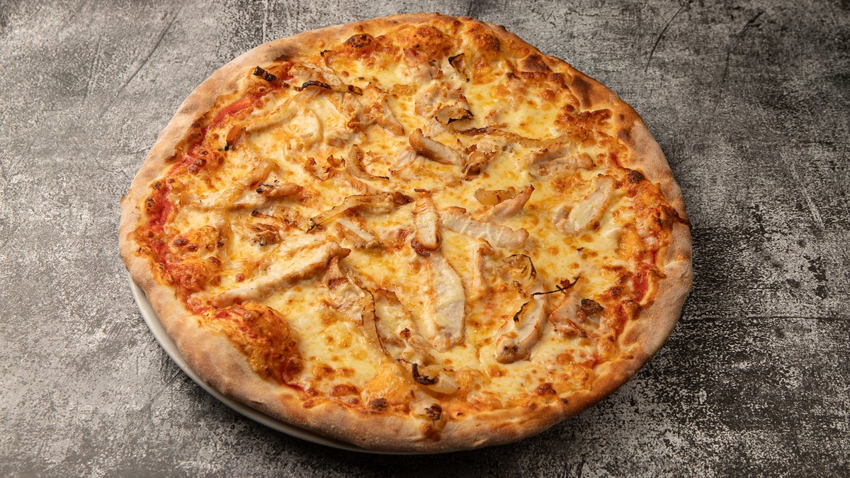 Σάλτσα ντομάτας, τυρί, κοτόπουλο σχάρας, κεφαλοτύρι, κεφαλοτύρι και καραμελωμένα κρεμμύδια