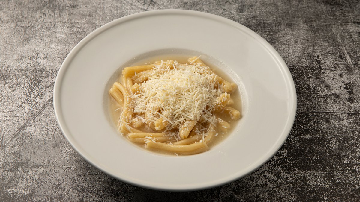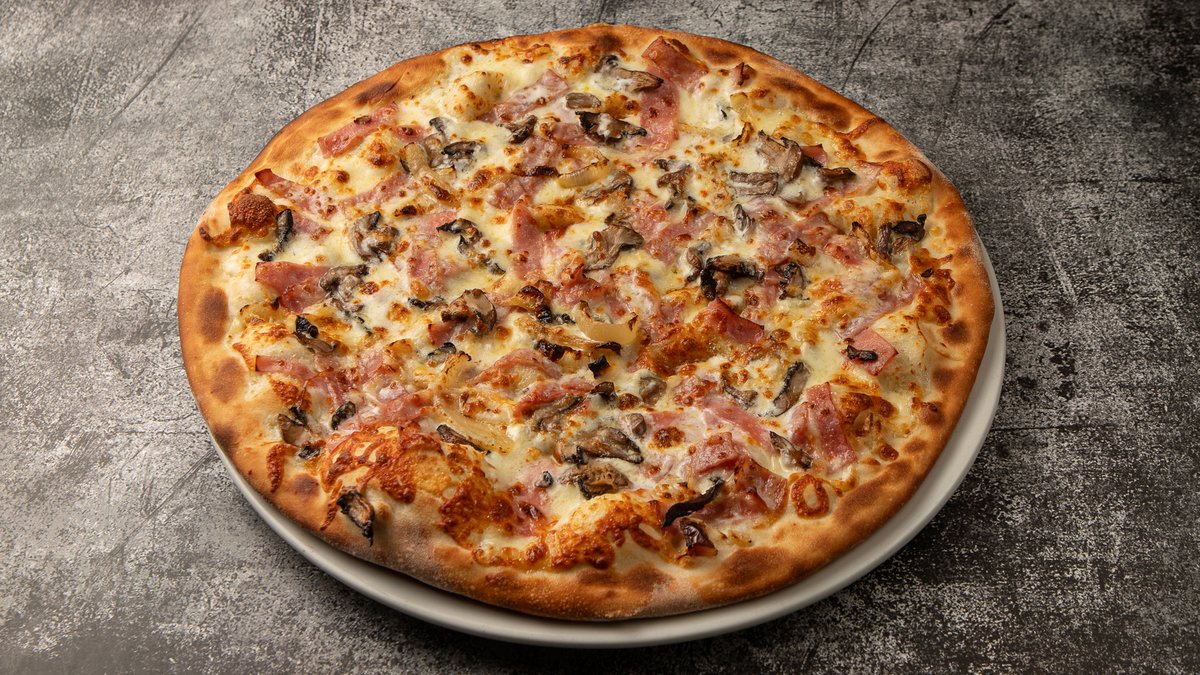 Με ζαμπόν, μπέικον, μανιτάρια, κεφαλοτύρι και κρέμα γάλακτος. Συνοδεύεται από extra τριμμένο κεφαλοτύρι