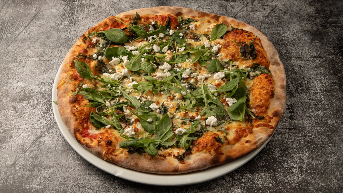 Σάλτσα ντομάτας, τυρί, σπανάκι φρέσκο, σπανάκι baby, ρόκα, φρέσκο κρεμμύδι και φέτα, ξινή μυζήθρα