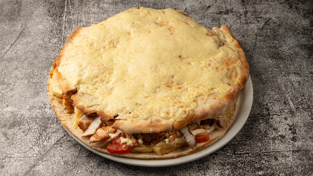 Σκεπαστή με κοτόπουλο φιλέτο με πατάτες τηγανητές, κρεμμύδι, ντομάτα φρέσκια, τυρί, μαγιονέζα