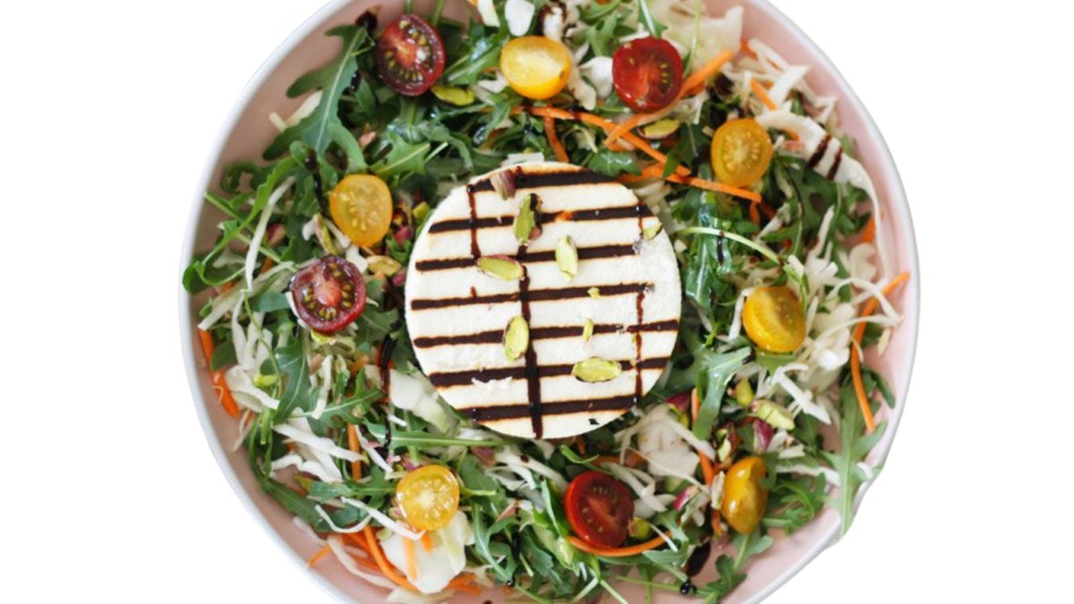 Τραγανό σταμναγκάθι και φρέσκο ραδίκι με ρόδι, καρύδια και ντοματίνια, φλοίδες γραβιέρας και δροσερό ντρέσινγκ μελιού και θυμαριού.