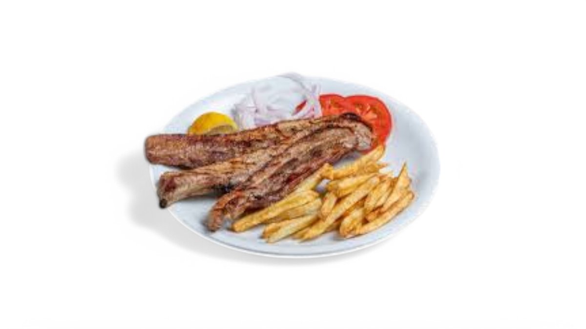 Περιλαμβάνει λουκάνικο κοτόπουλο χοιρινά μπριζολάκια λαιμού πανσέτα και άφθονες φρέσκες πατάτες τηγανιτές