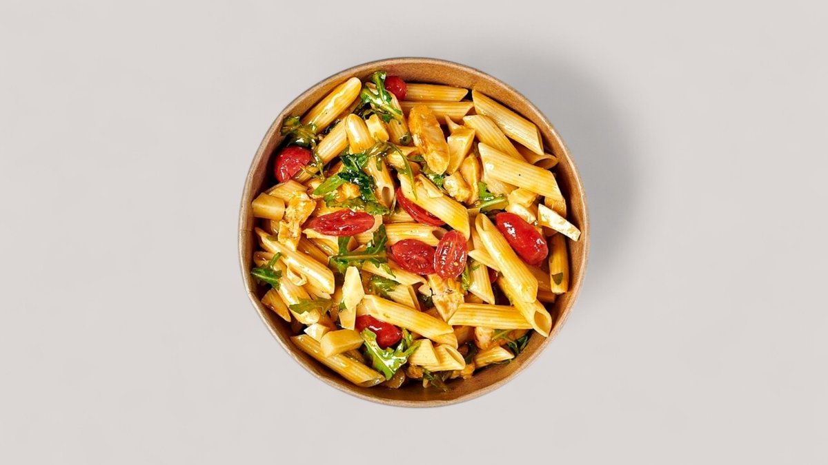 με Πέννες, Μαρούλι, Λάχανο, Ντοματίνια, Μαγιονέζα και Κοτόπουλο