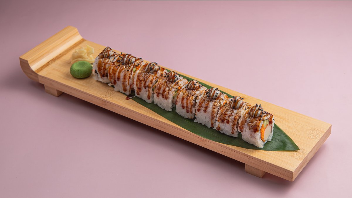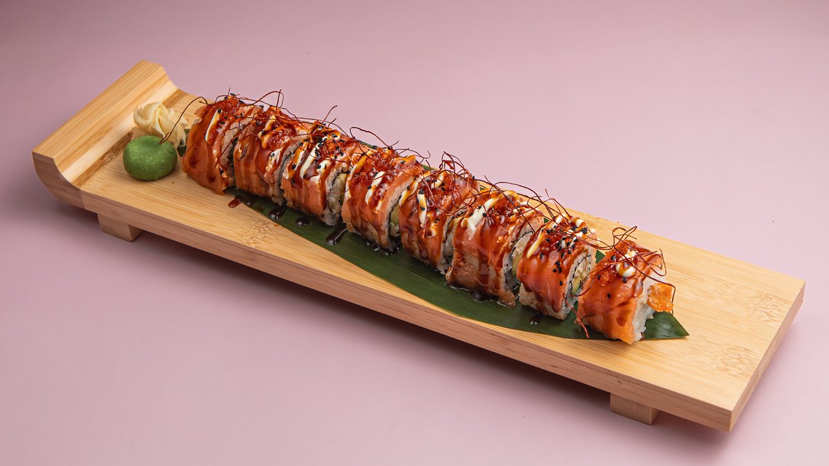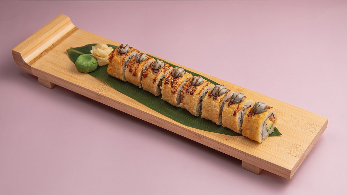 2 γαρίδες τεμπούρα, κρέμα τυρί, αβοκάντο και επικάλυψη από καπνιστό σολομό μαριναρισμένο σε teriyaki