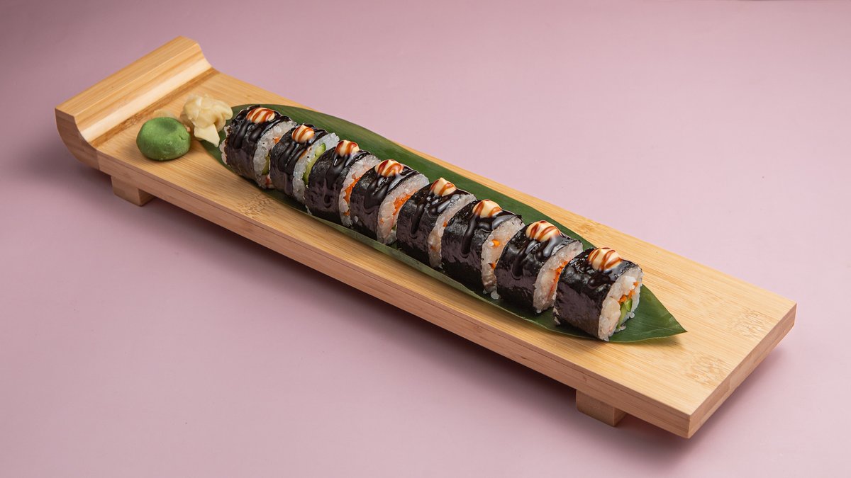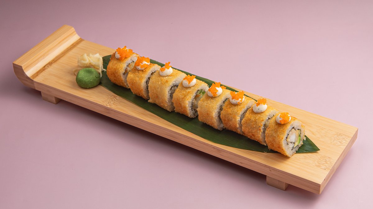 8 τεμάχια. Τραγανό κοτόπουλο ,Philadelphia ,avocado, καρότο,mango sauce και teriyaki mayo dressing