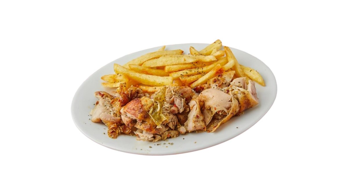 Συνοδεύεται από πατάτες τηγανητές και πιτάκια