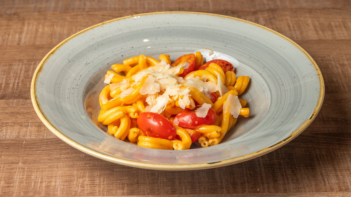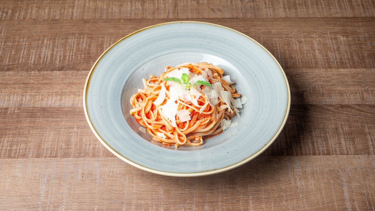 Tagliatelle με κομματάκια μόσχου, φρέσκια ντομάτα, κρέμα γάλακτος και παρμεζάνα