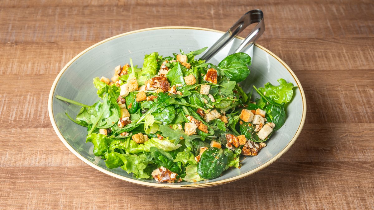 Βαλεριάνα, σπανάκι, ρόκα, iceberg, μαρούλι, παστέλι από ξηρούς καρπούς, κρουτόν και βινεγκρέτ εσπεριδοειδών