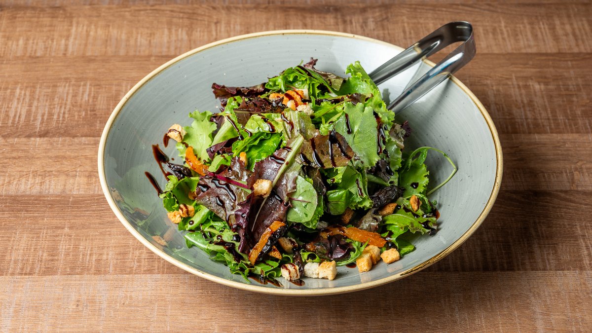 Baby φύλλα πράσινου και κόκκινου μαρουλιού, άγριας ρόκας, σπανακιού και παντζαριού, αποξηραμένα φρούτα, κρουτόν και βινεγκρέτ μελιού