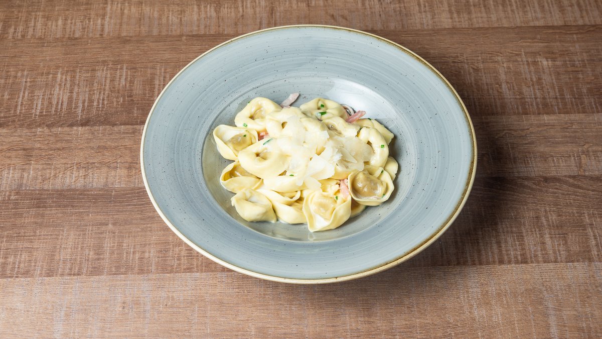 Τορτελίνι με κρέμα γάλακτος, prosciutto cotto και σχοινόπρασο