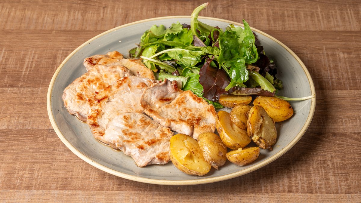 Φιλετάκια χοιρινά με σάλτσα λεμονιού. Συνοδεύεται με baby πατάτες φούρνου και φρέσκια τρυφερή σαλάτα