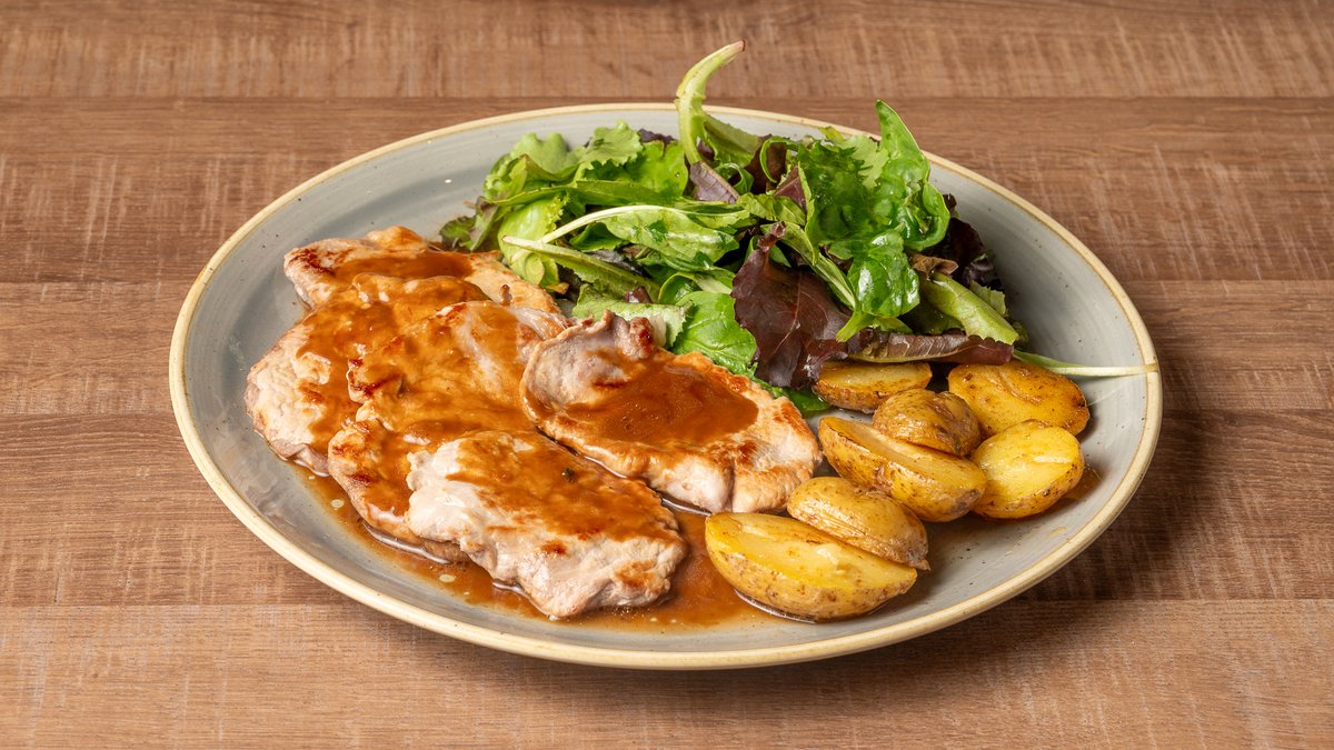 Φιλετάκια χοιρινά με σάλτσα από κρασί Μάρσαλ. Συνοδεύεται με baby πατάτες φούρνου και φρέσκια τρυφερή σαλάτα