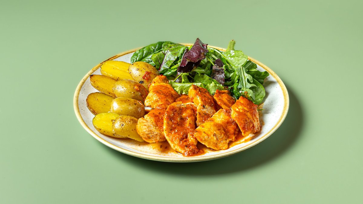 Φιλέτο κοτόπουλο με σάλτσα ντομάτας και βότανα . Συνοδεύεται με baby πατάτες φούρνου και φρέσκια τρυφερή σαλάτα
