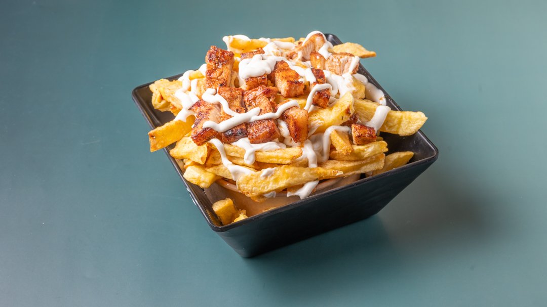 Πατάτες Τηγανητές Με ΔΙΠΛΗ Ψιλοκομμένη Πανσέτα, Σως Γιαουρτιού και Bbq Sauce
