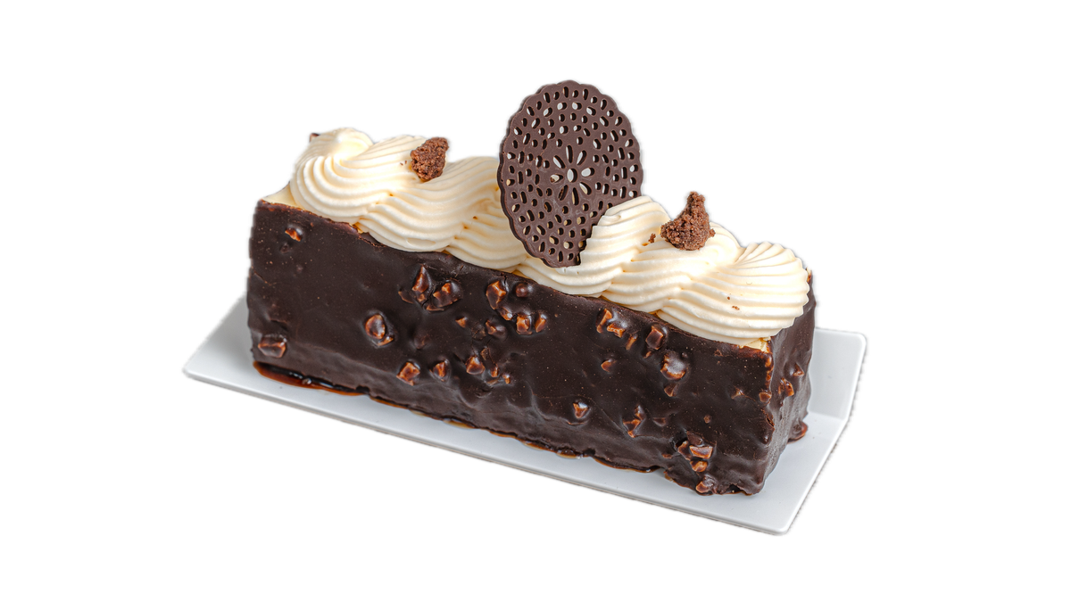 Κορμός σοκολάτας με biscuir κακάο, mousse σοκολάτας γάλακτος και επικάλυψη σοκολάτας με φουντούκια