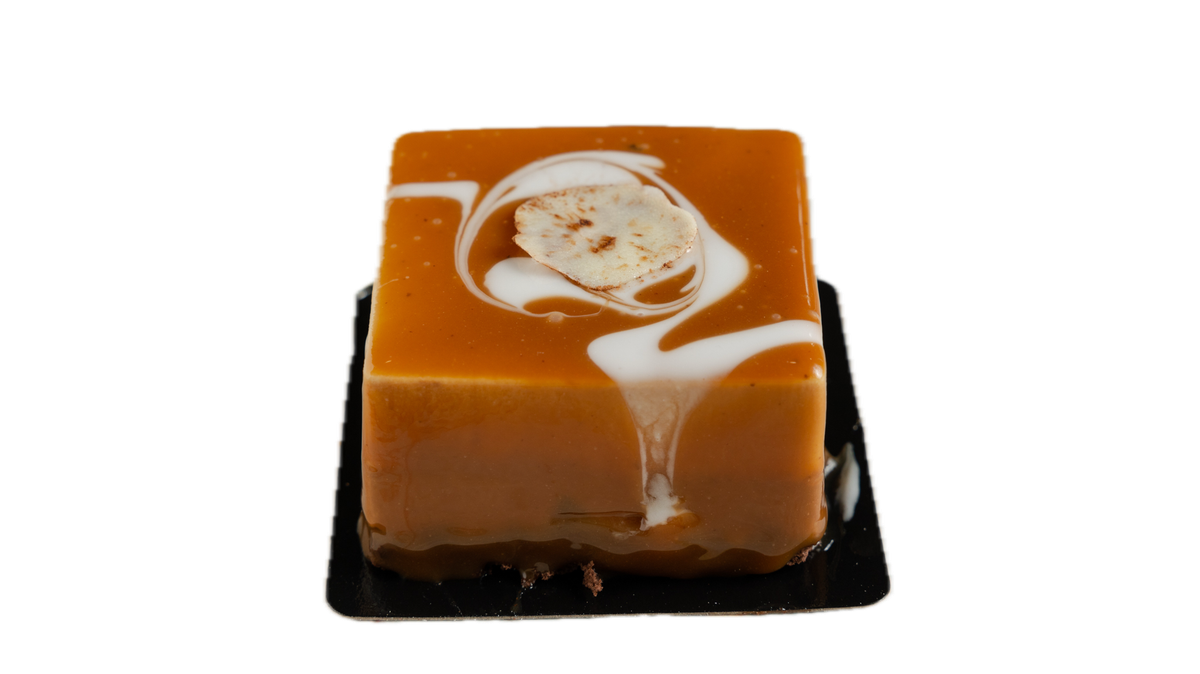 Σε χειροποίητη, τραγανή βάση ganache αλμυρής καραμέλας, mousse σοκολάτας γάλακτος, χειροποίητη πάστα φουντουκιού και καραμελωμένα φουντούκια