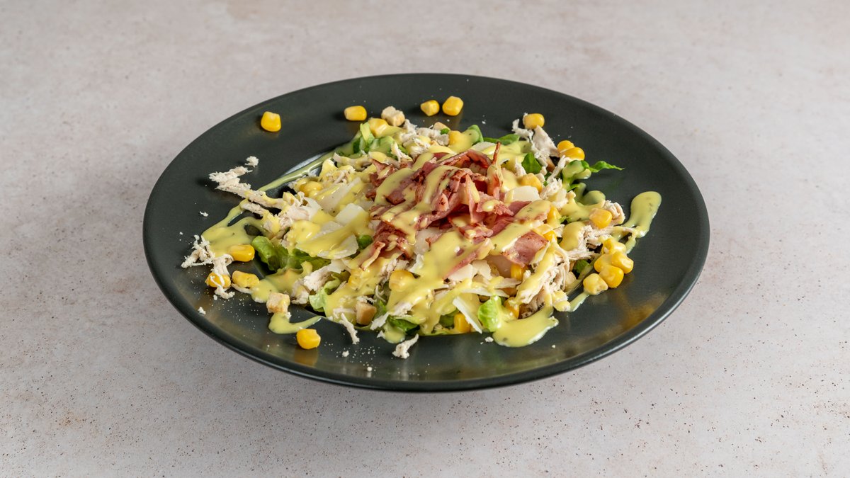 Σαλάτα με mix λαχανικών, κρουτόν, παστό χοιρινό, αυγό μελάτο, κοτόπουλο, παρμεζάνα και dressing από καπνιστό χέλι